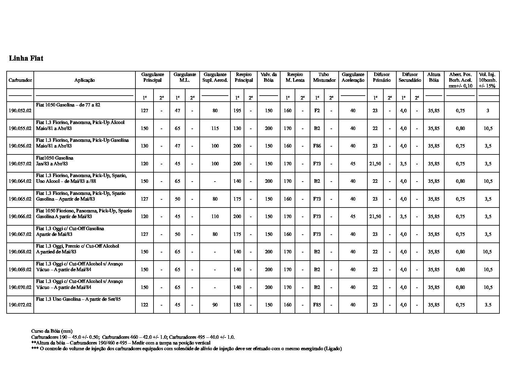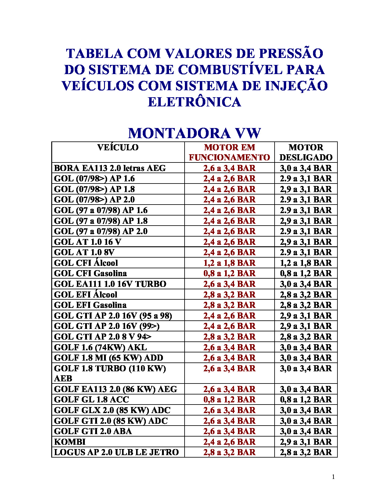 Tabela de Pressão de Bombas de Combustível Automotiva