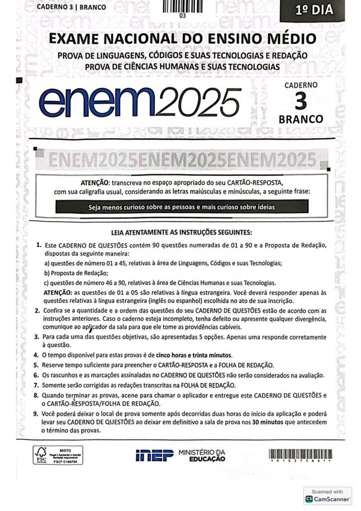 Prova Enem Primeiro Dia Caderno Branco – 2025